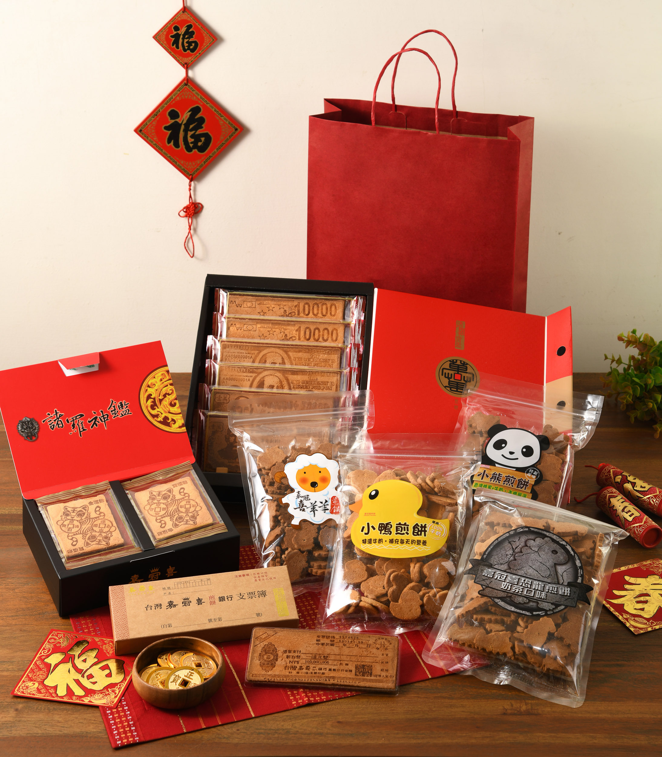 2026賀歲鈔財納福煎餅大禮包_造型煎餅版* 1 組/免運費 (鈔票煎餅禮盒1盒+招財迎春 烙印煎餅系列禮盒1盒+羊羊煎餅4包+附大紙袋)