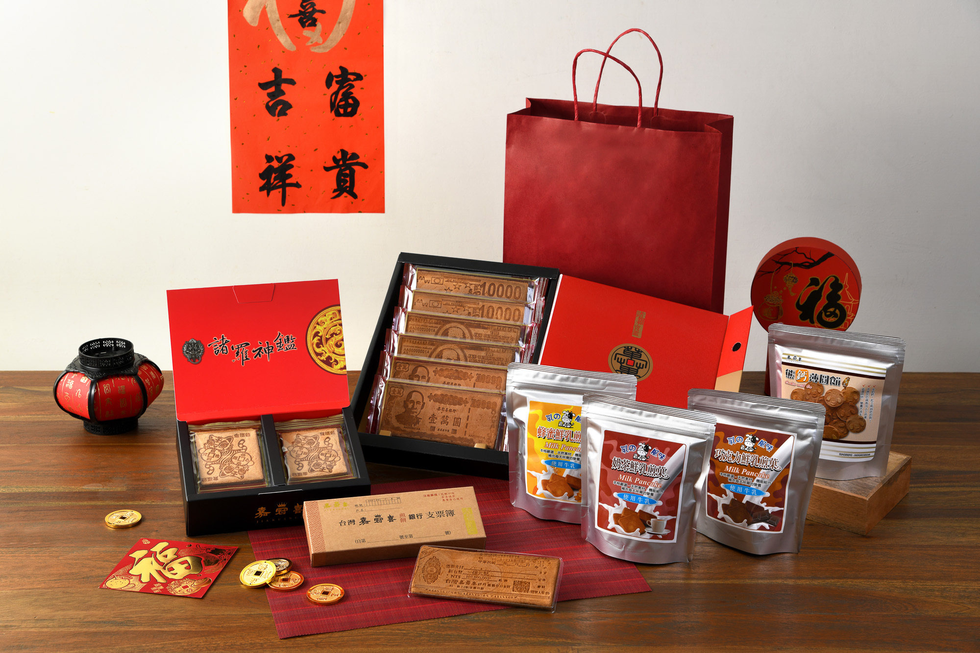 2026賀歲鈔財納福煎餅大禮包_特濃鮮乳版* 1 組/免運費 (鈔票煎餅禮盒1盒+支票煎餅*1盒+招財迎春 烙印煎餅系列禮盒1盒+特濃奶茶煎餅1包+特濃蜂蜜煎餅1包、特濃巧克力煎餅1包+熊鈣薄煎餅1包+附紙袋)